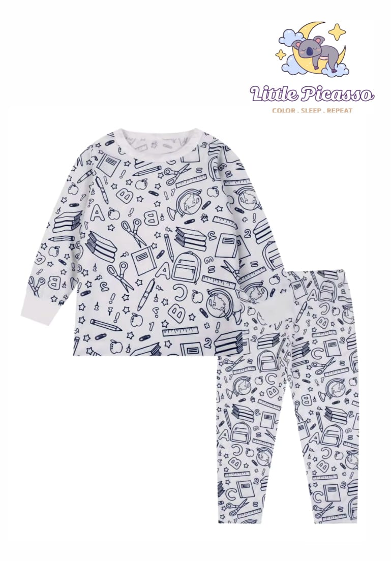 The Little Scholar’s Canvas Adventure pajamas turn bedtime into a magical classroom where creativity meets learning. Kids can color books, scissors, erasers, and school tools on these soft PJs, fostering fine motor skills and school readiness.
